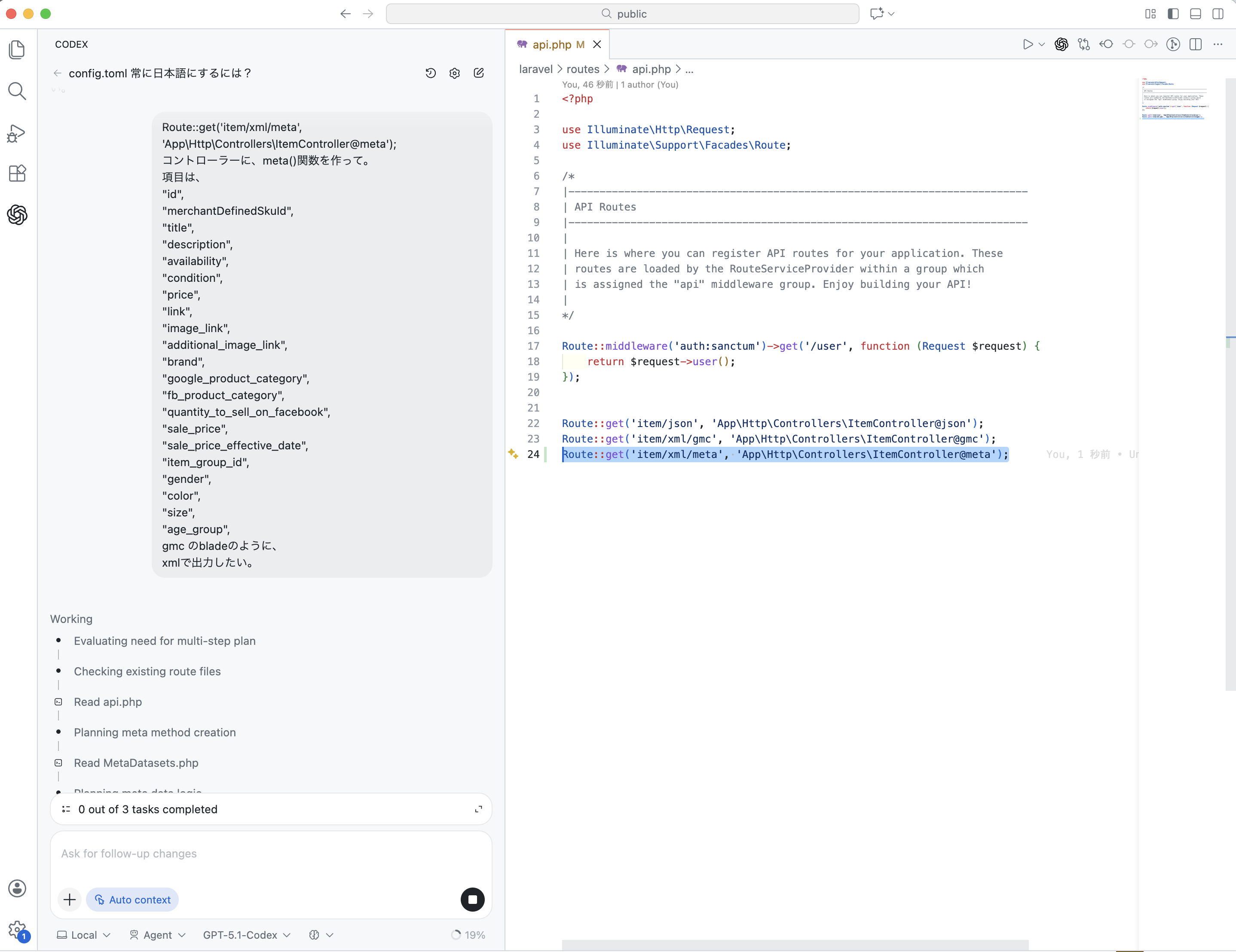 特に注目すべきは、ChatGPTの最新バージョンである「chatGPT5.1-Codex」との連携です。この連携により、自然言語を使った指示で、ただのメッセージのやり取りにとどまらず、より精度の高いコード生成が可能になります。また、VSCode内で直接出力を確認できるため、作業の流れを途切れさせずにプログラムを進めることができる点も大きな利点です。