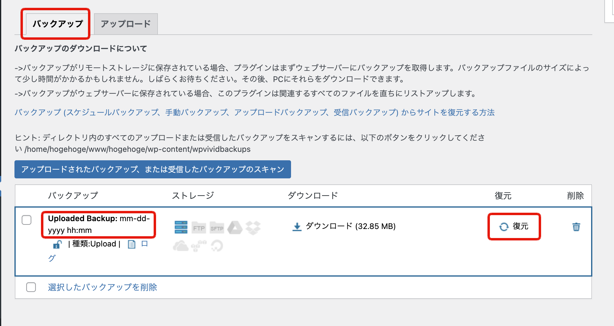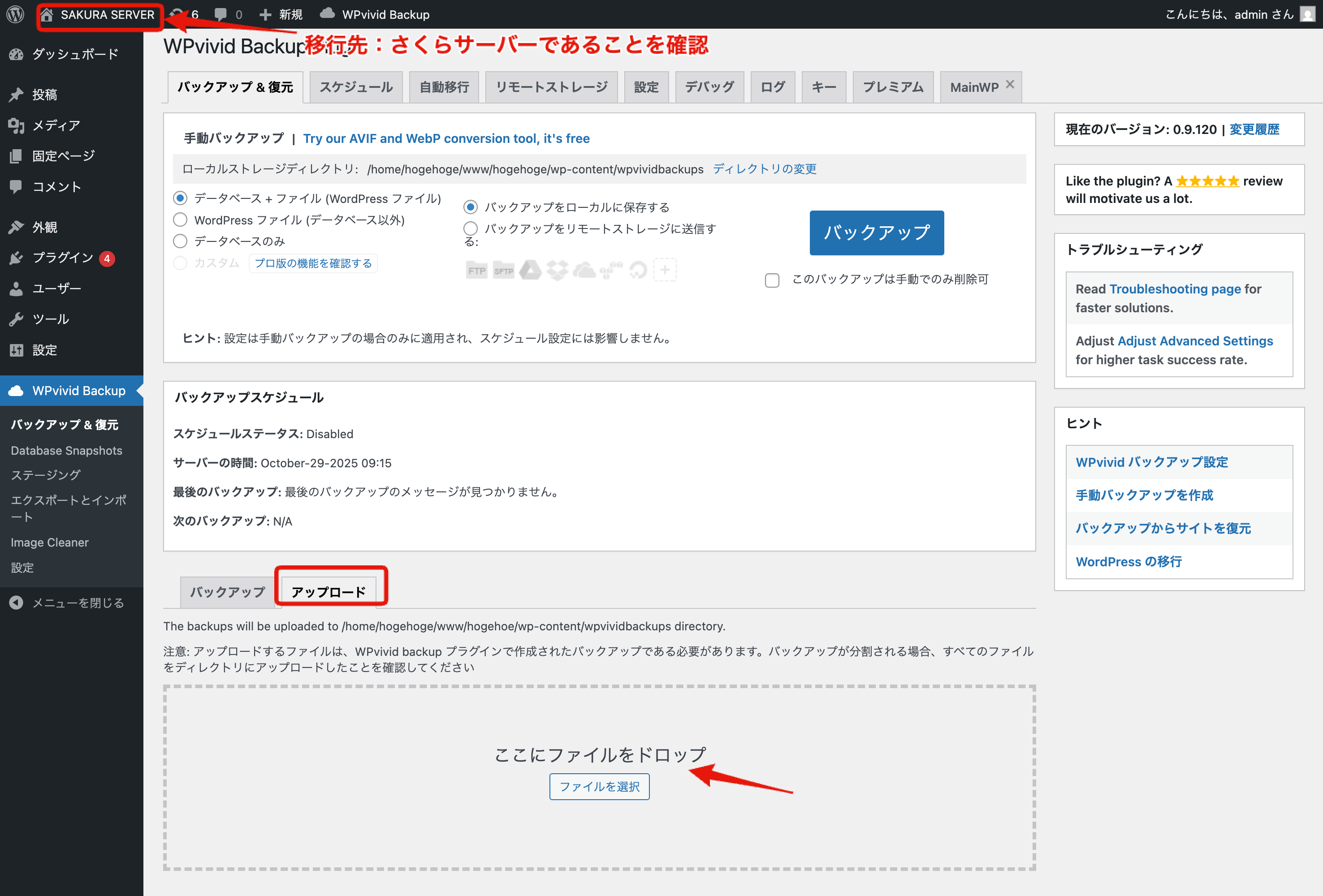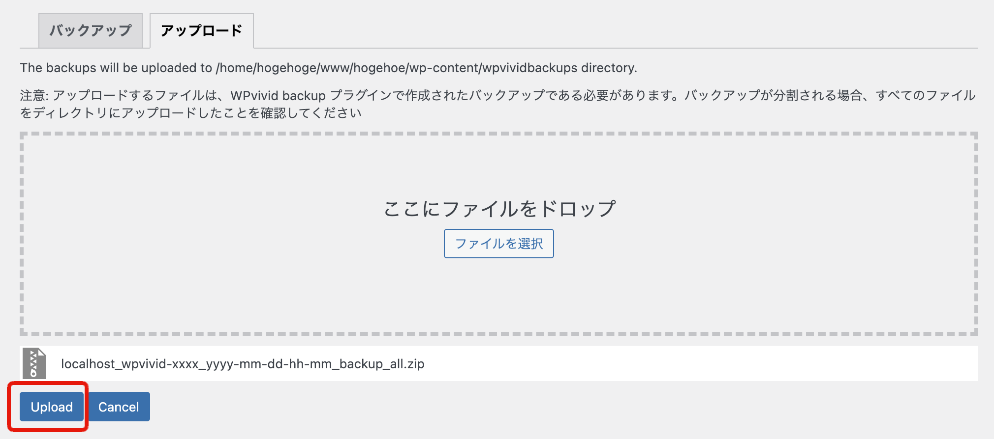 移行先でインポート:移行先のサイトにログイン後、WPvividの「バックアップと復元」タブからインポート機能を使用して、先ほど作成したバックアップファイルをアップロードします。