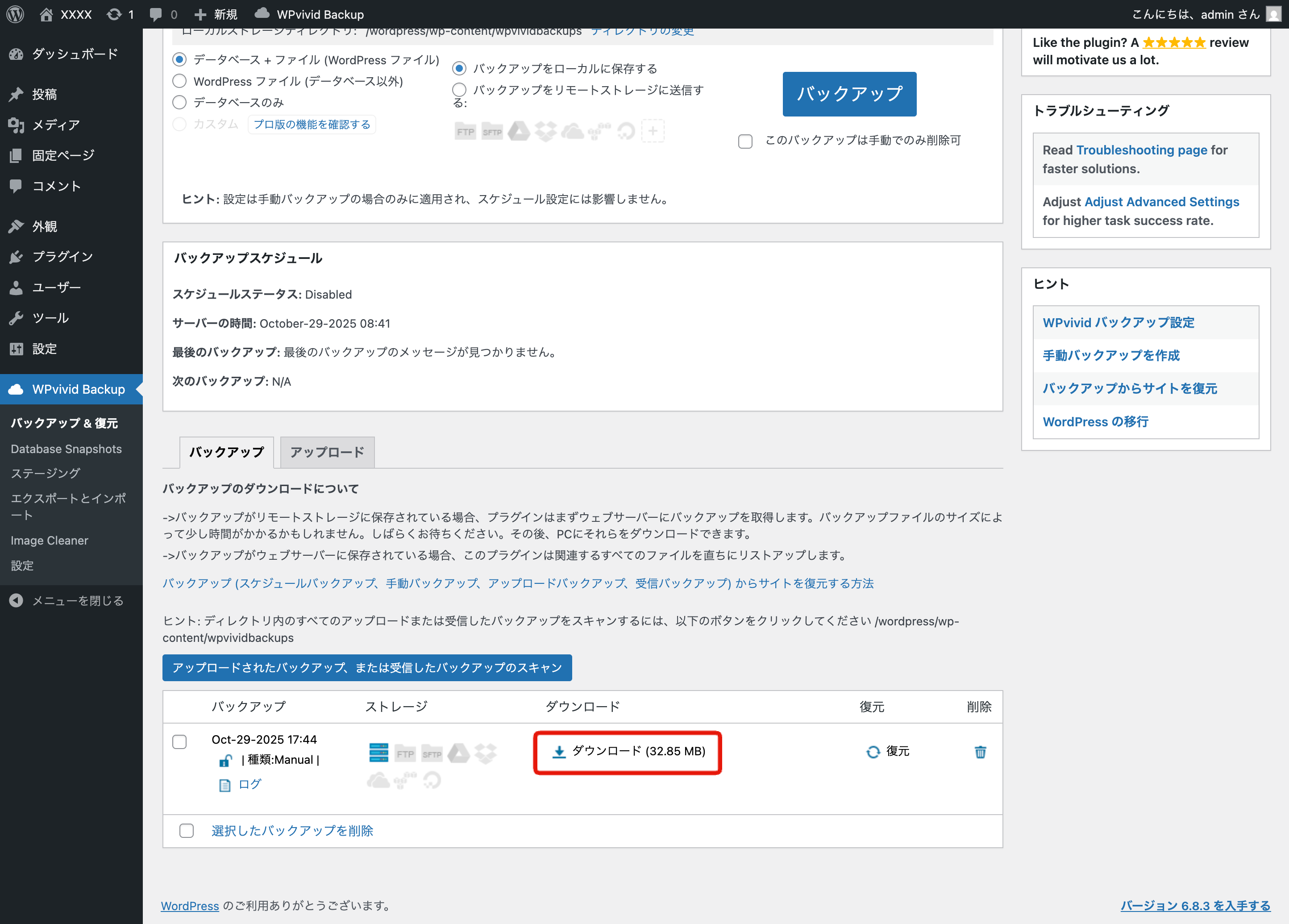 また、「詳細設定」では、対象をファイル、データベース、またはその両方に絞ることも可能です。バックアップ完了後はリスト形式で保存されたデータが確認でき、必要に応じてダウンロードや削除も可能です。この手軽さがWPvivid Backup & Migration Pluginの大きな魅力です。