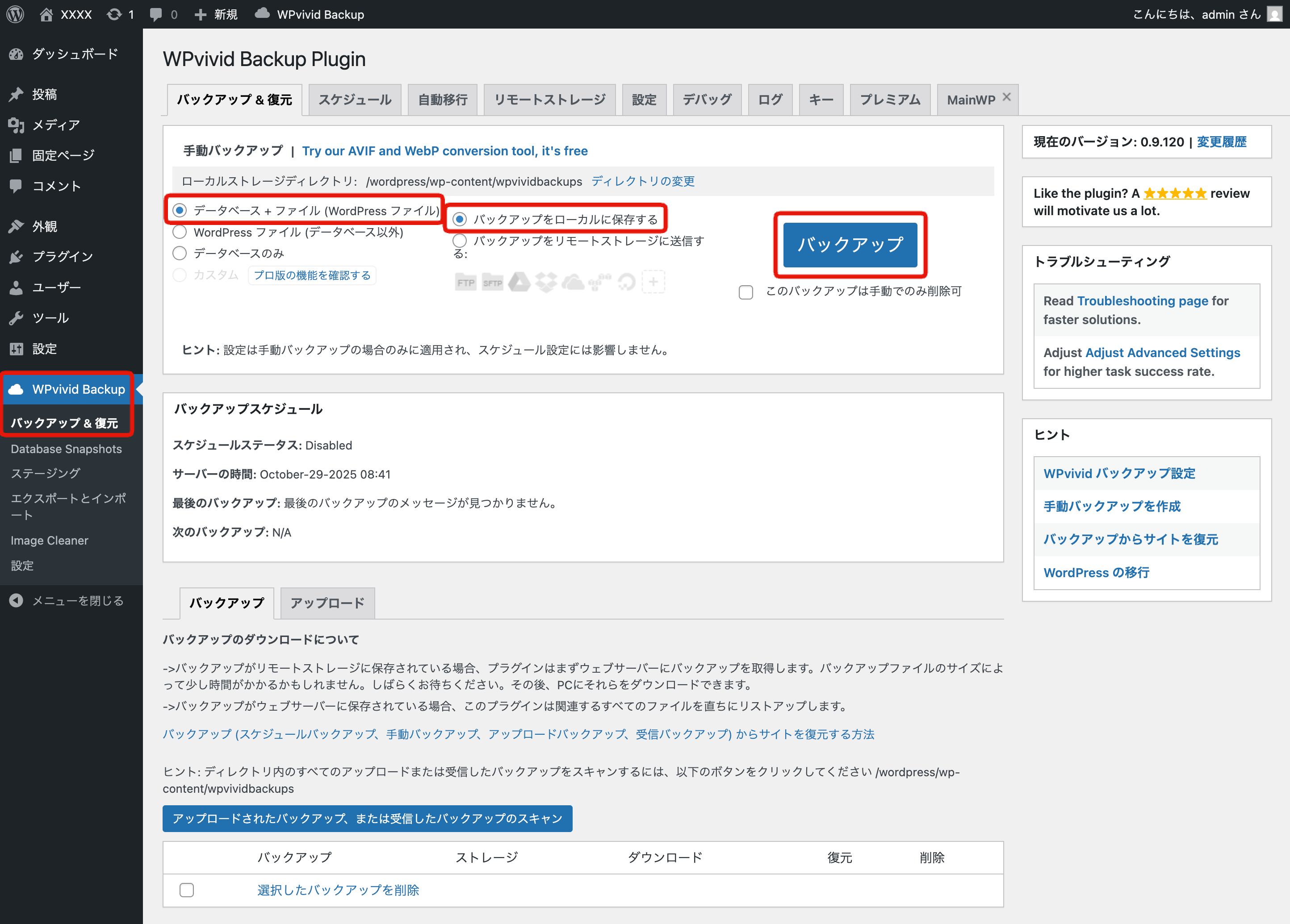移行元でバックアップを作成:WPvividプラグインのダッシュボードにアクセスし、「バックアップと復元」メニューから「バックアップ」を開始します。